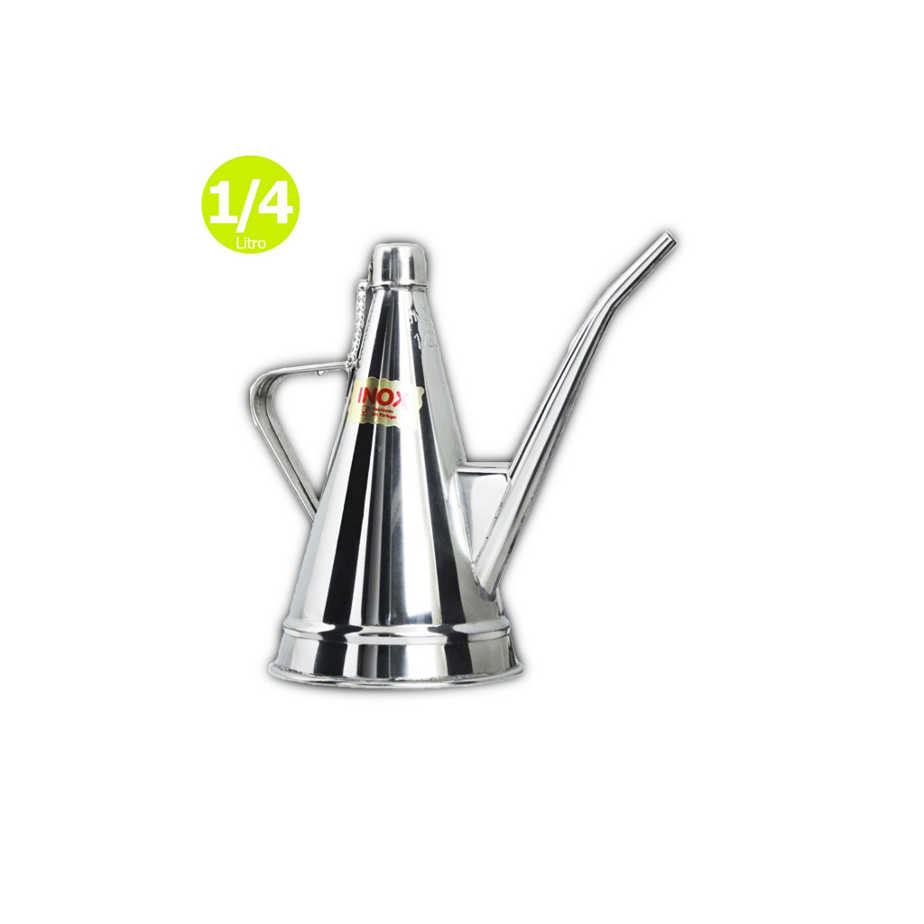 Vasilha portátil de inox, de forma cónica com tampa e bico fino, para azeite e outros líquidos oleosos.