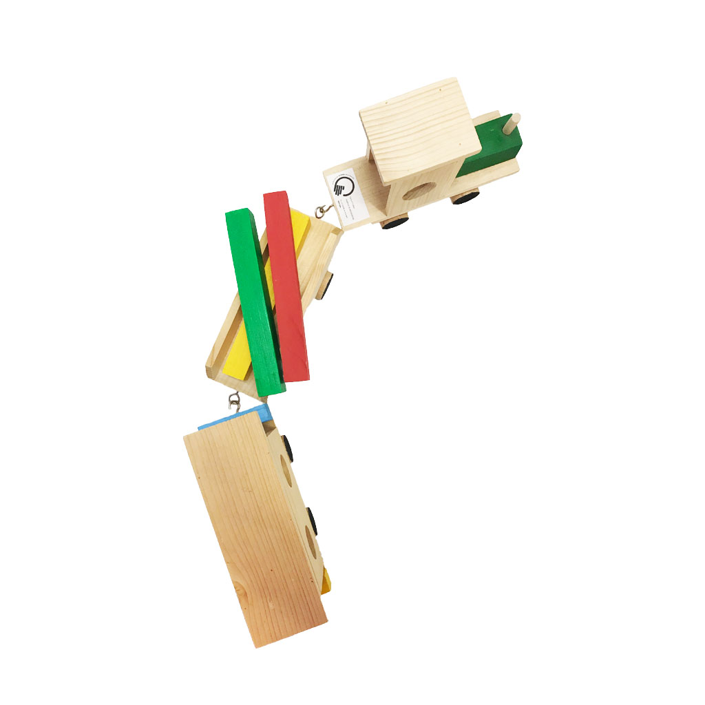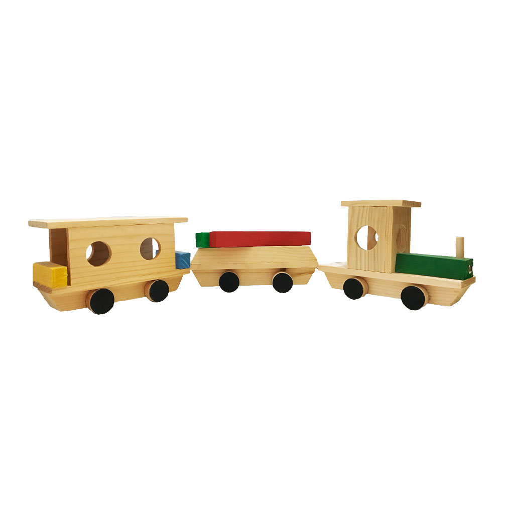 As rodinhas giram normalmente e contem 3 carruagens presas por grampos para desmontar, uma delas com 3 blocos de madeira soltos para dar asas a imaginação e brincar bastante.