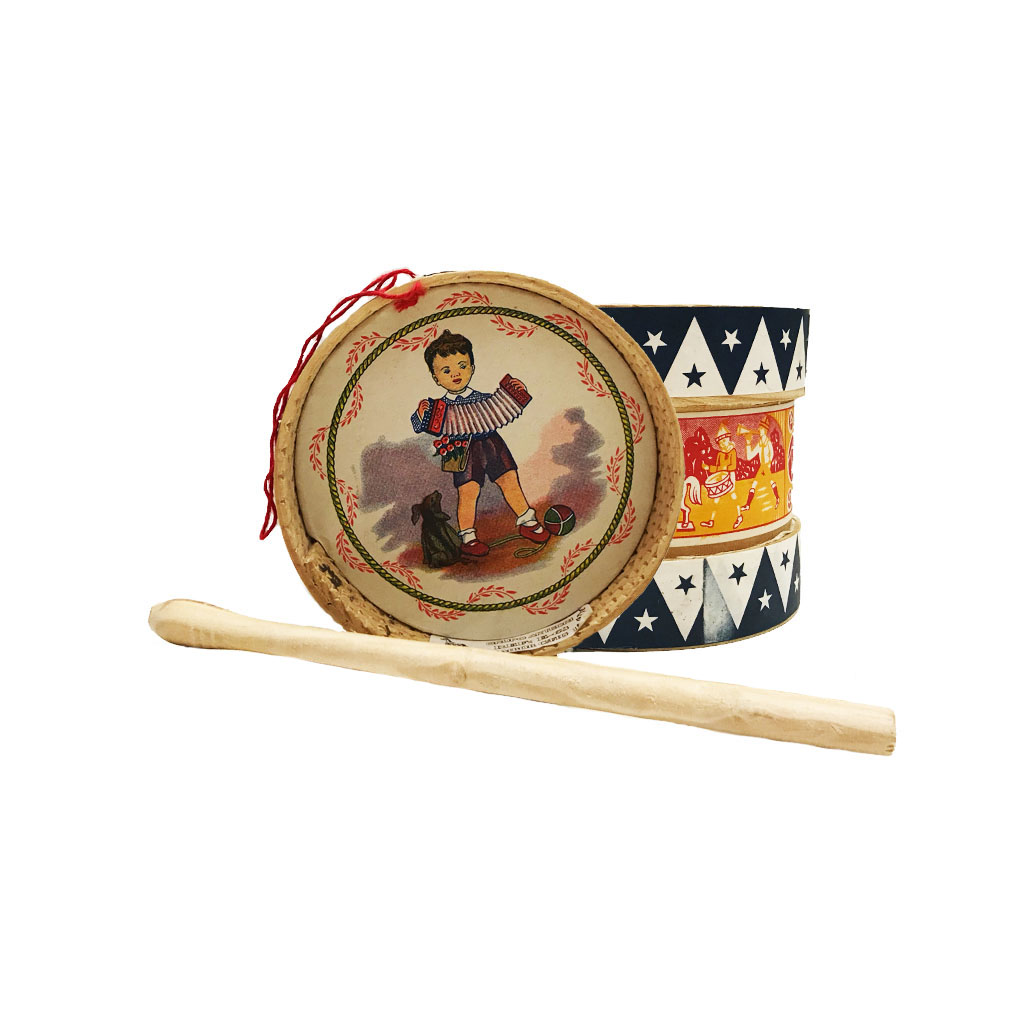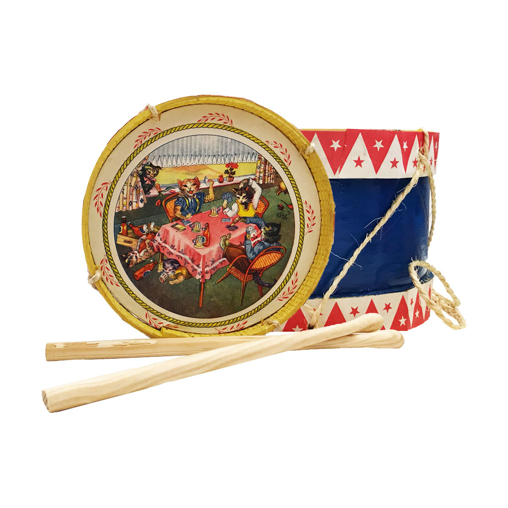 Tambor feito à mão por artesãos. Com ilustração colorida e rebordo em madeira, o som que deixa alegres tantos petizes.