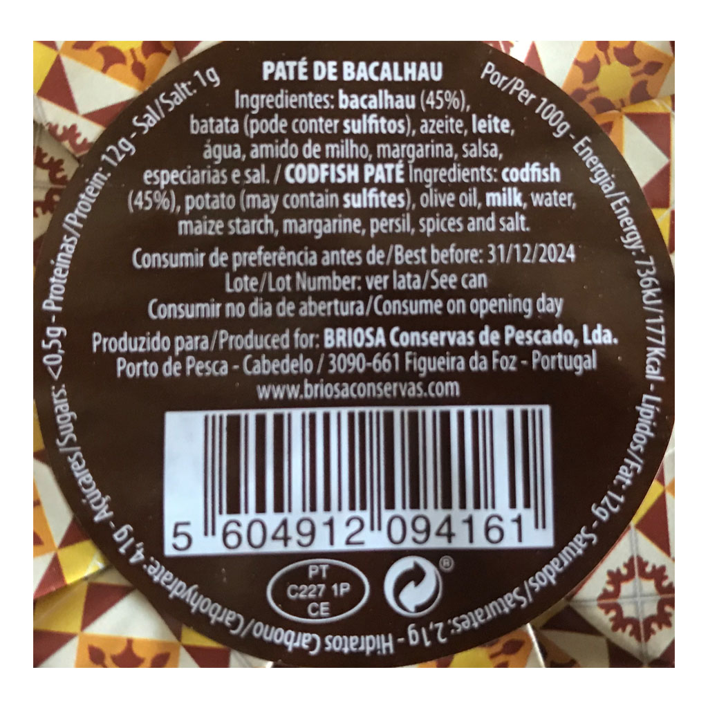 Ingredientes: Bacalhau (70%), azeite, margarina, Leite, Nata, farinha de Trigo, amido, milho e sal.