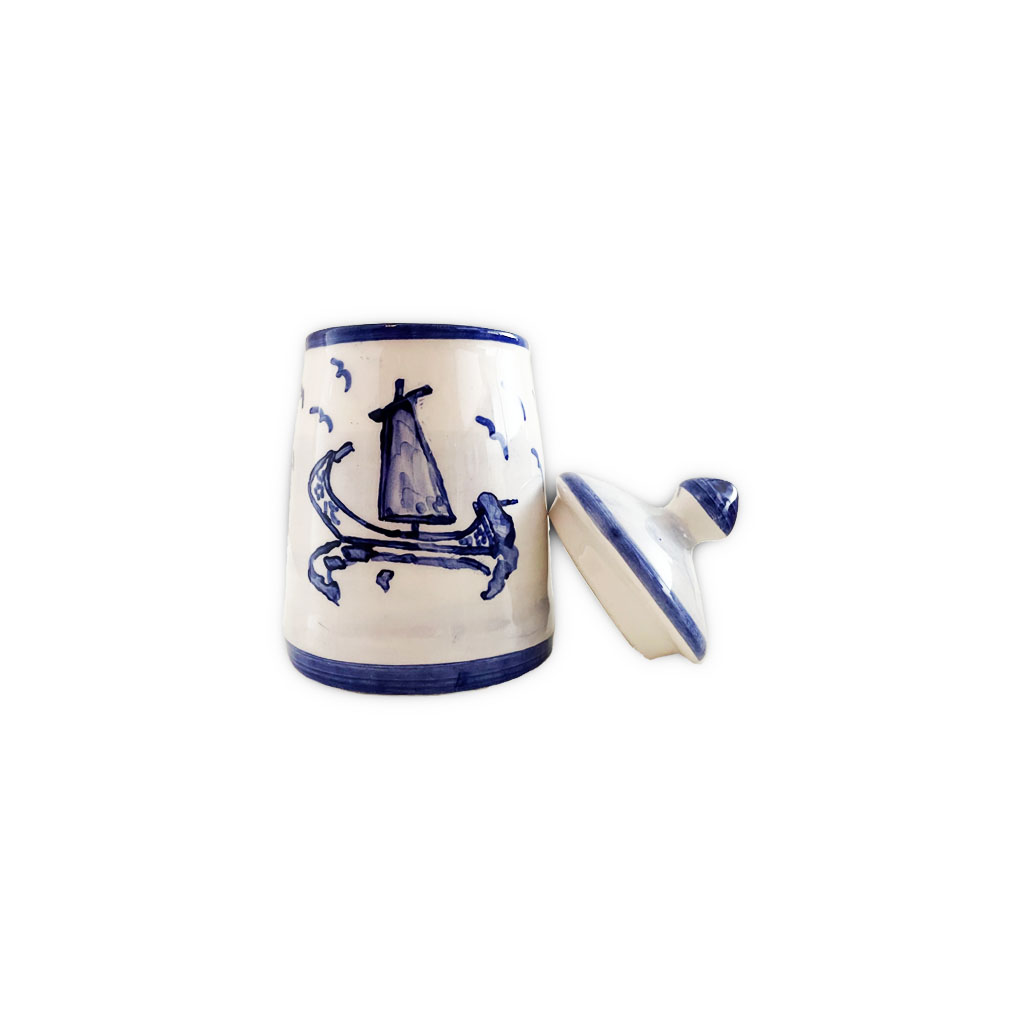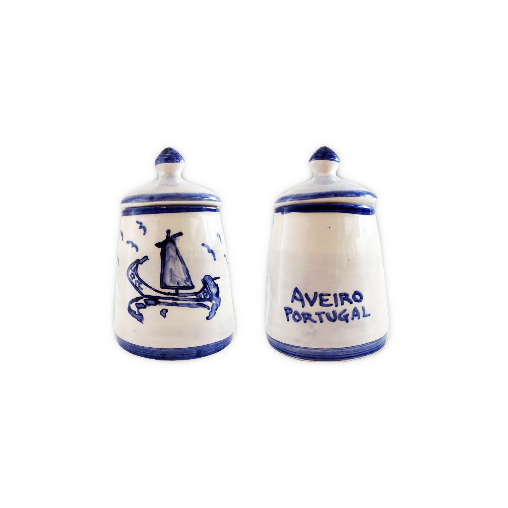 Pote com tampa de louça, ligeiramente afunilado, pintada à mão com motivos da cidade de Aveiro.