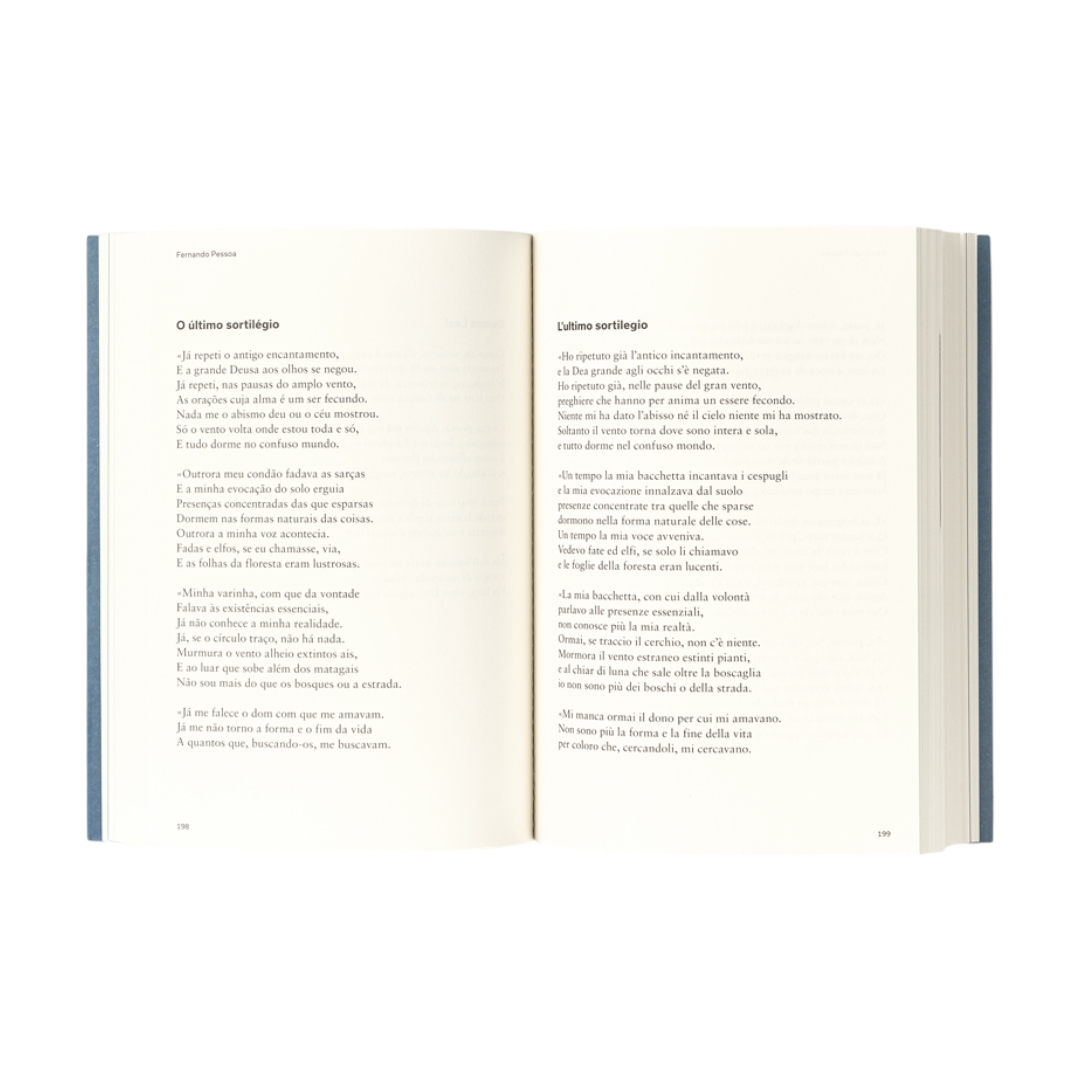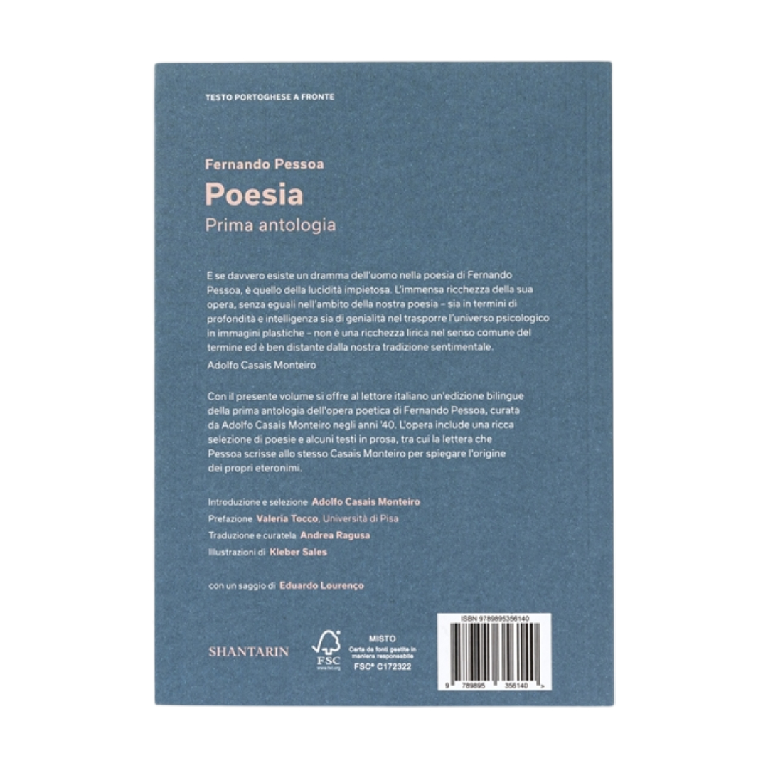 Con il presente volume si offre al lettore italiano un’edizione bilingue della prima antologia dell’opera poetica di Fernando Pessoa, curata da Adolfo Casais Monteiro negli anni ‘40. L’opera include una ricca selezione di poesie e alcuni testi in prosa, tra cui la lettera che Pessoa scrisse allo stesso Casais Monteiro per spiegare l’origine dei propri eteronimi. Traduzione e curatela di Andrea Ragusa. Illustrazioni di Kleber Sales.