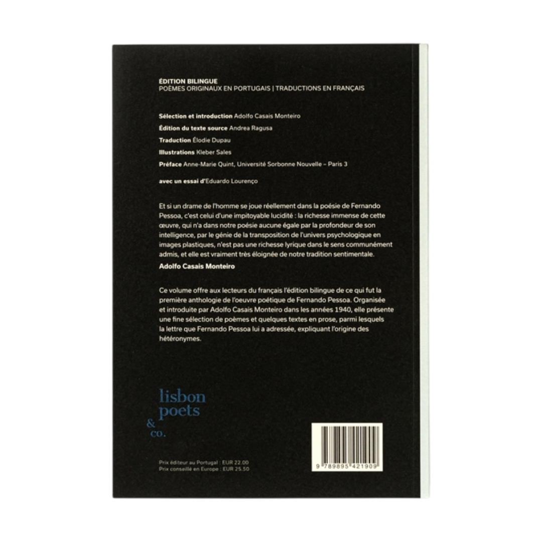 Este volume oferece aos leitores em língua francesa a edição bilingue daquela que foi a primeira antologia da obra poética de Fernando Pessoa. Organizada e introduzida por Adolfo Casais Monteiro na década de 1940, inclui uma fina selecção de poemas e alguns textos em prosa, entre os quais a carta que Fernando Pessoa endereçou a Casais Monteiro a explicar a origem dos seus heterónimos. Com traduções de Élodie Dupau e ilustrações de Kleber Sales.