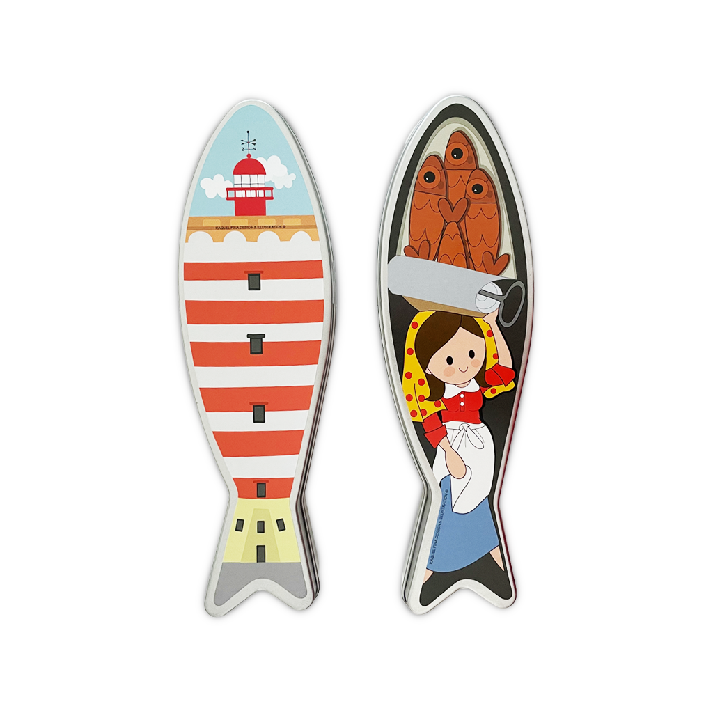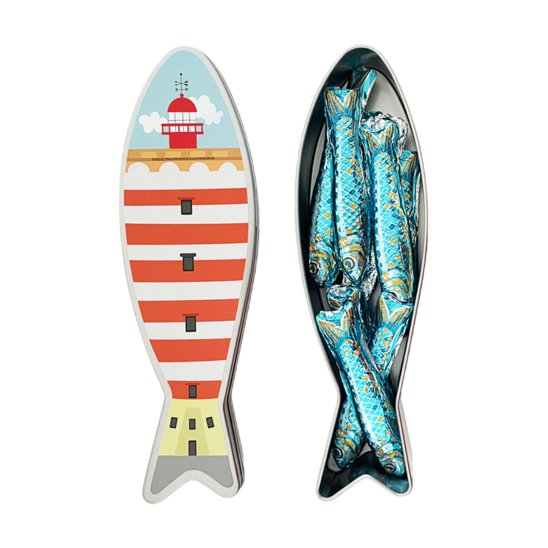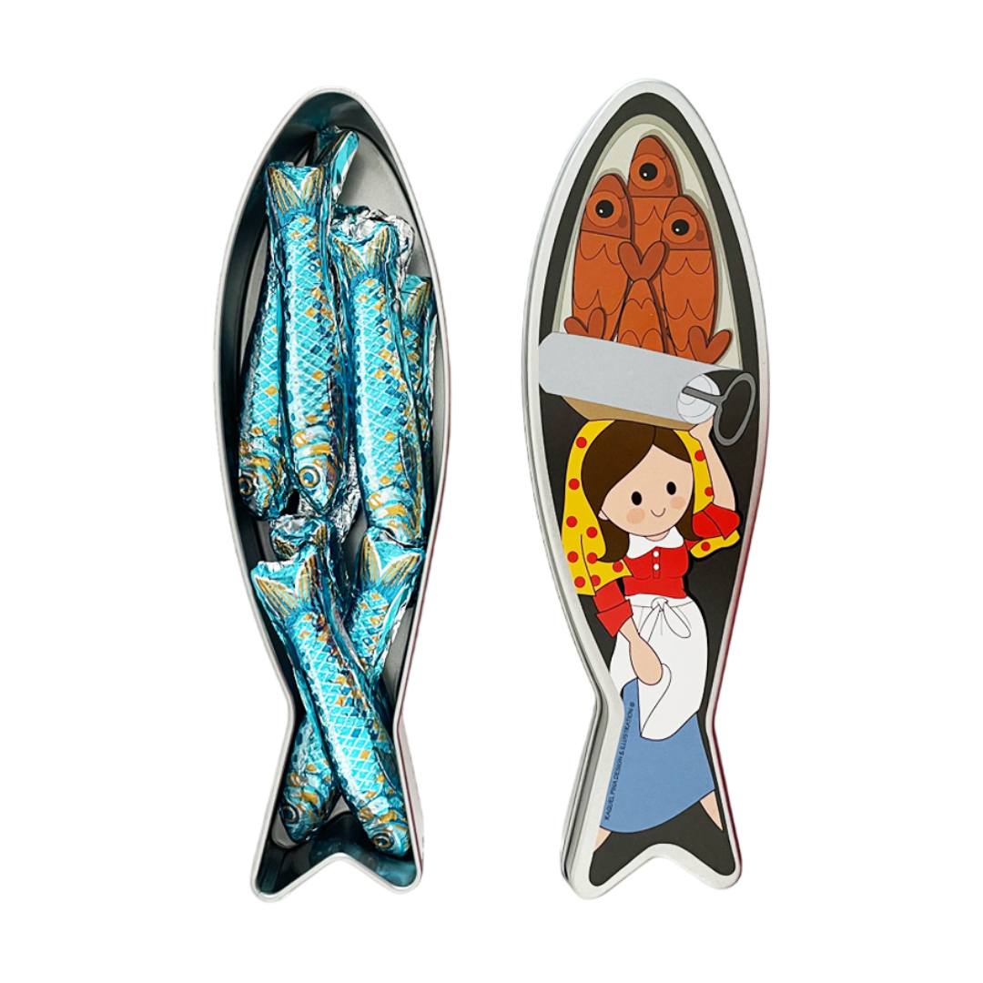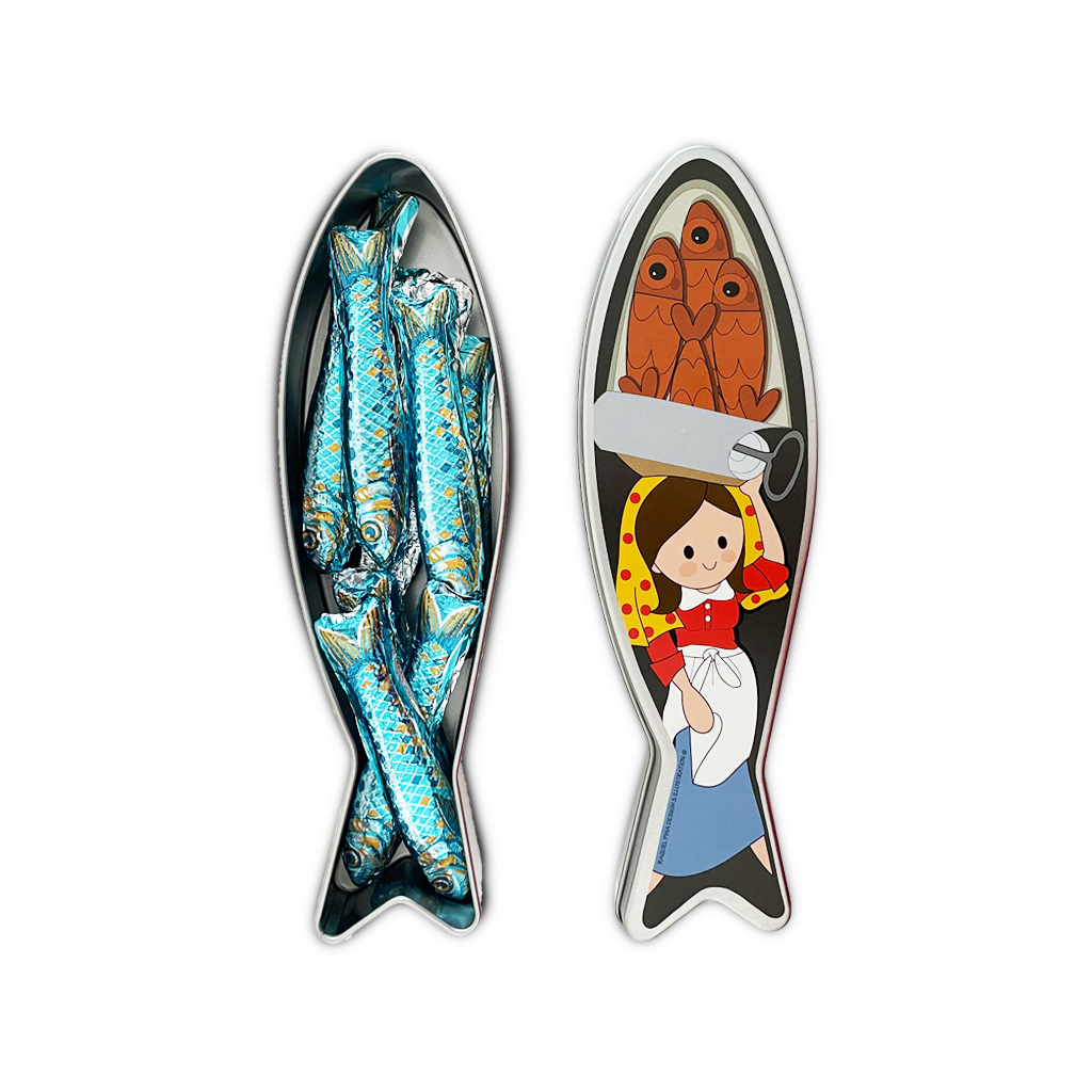 Lata em forma de sardinha ilustrada com doze chocolates de leite em forma de sardinha no interior.