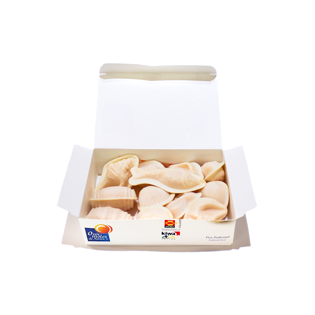 Os Ovos Moles são servidos em hóstia (obreia), por influência conventual, em formas que remetem para a cidade de Aveiro e a sua tradição piscatória e proximidade com o mar — os peixes, os búzios ou as conchas. Mas também são apresentados dentro de pequenas barricas pintadas à mão.